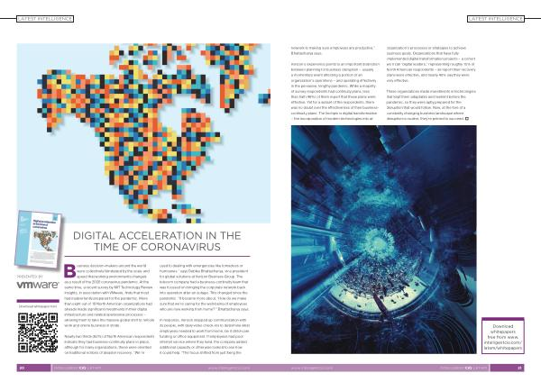 Business decision-makers around the world were collectively blindsided by the scale and speed that working environments changed as a result of the 2020 coronavirus pandemic . At the same time , a recent survey by MIT Technology Review Insights , in association with VMware , finds that most had inadvertently prepared for the pandemic . More than eight out of 10 North American organizations had already made significant investments in their digital infrastructure and related operational processes – allowing them to take the massive global shift to remote work and online business in stride .