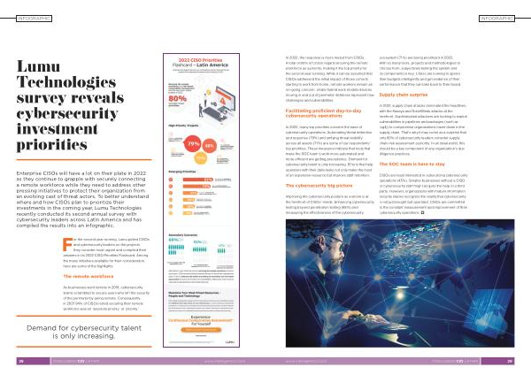 Enterprise CISOs will have a lot on their plate in 2022 as they continue to grapple with securely connecting a remote workforce while they need to address other pressing initiatives to protect their organization from an evolving cast of threat actors . To better understand where and how CISOs plan to prioritize their investments in the coming year , Lumu Technologies recently conducted its second annual survey with cybersecurity leaders across Latin America and has compiled the results into an infographic .