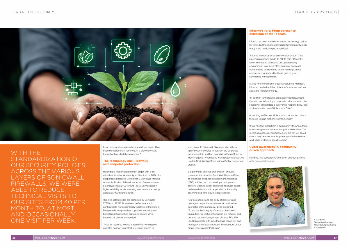 Holambra’ s modernization effort began with a full refresh of its network security architecture. In 2024, the cooperative deployed Generation 7 SonicWall firewalls across its 11 sites. At headquarters in Paranapanema, a SonicWall NSa 2700 Firewall-as-a-Service runs in high availability mode, ensuring zero downtime during updates or hardware failures.