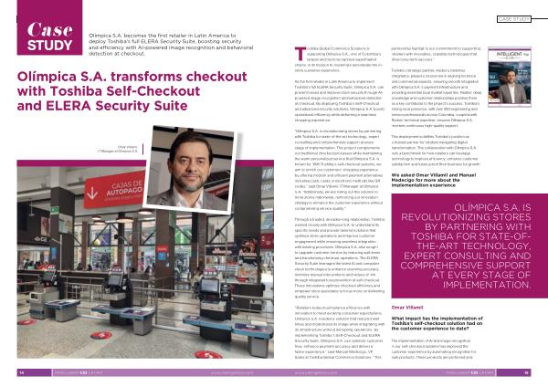 As the first retailer in Latin America to implement Toshiba’ s full ELERA Security Suite, Olímpica S. A. can prevent losses and improve store security through AIpowered image recognition and behavioral detection at checkout. By deploying Toshiba’ s Self-Checkout and advanced security solutions, Olímpica S. A. boosts operational efficiency while delivering a seamless shopping experience.